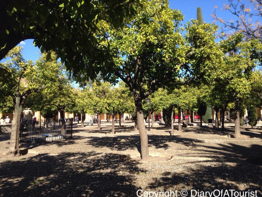 1630 Back out into the sunshine. Outside, there’s a courtyard of orange trees, and the Cathedral bell tower.