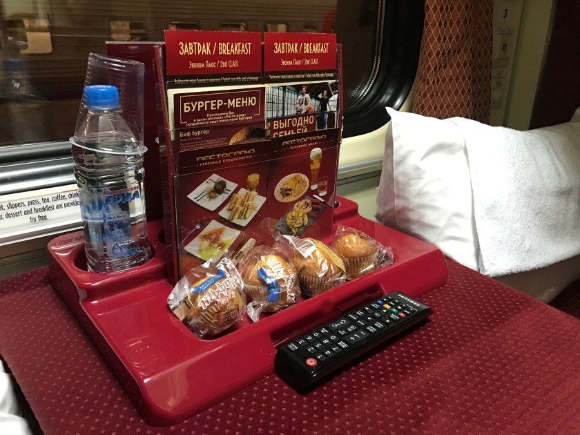 2300: Train arrives for 2344 departure and boarding starts. There’s a ticket and passport check at entrance to carriage. The Grand Express is a luxury private train running a sleeper service between St Petersburg and Moscow. The cabin is well appointed, good bedding and there’s also a digital TV with a choice of movies. In the standard carriage, there’s a toilet and washbasin in each carriage. You can also pay for a cabin with a private toilet and wash basin, or even one with a shower compartment.