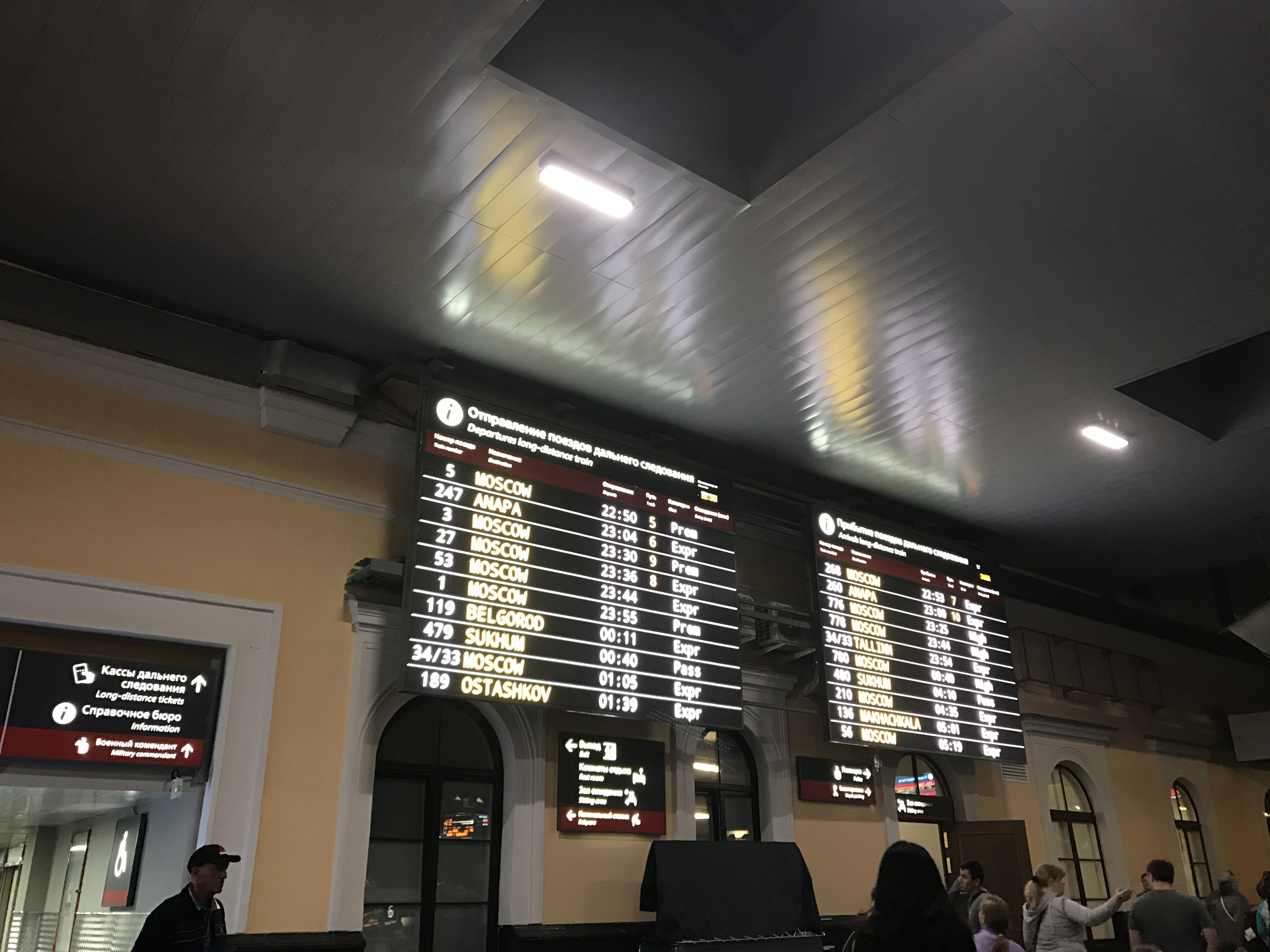 2215: Transfer to station to catch our sleeper train, the Grand Express, to Moscow. There is a luggage scan at entrance to station.