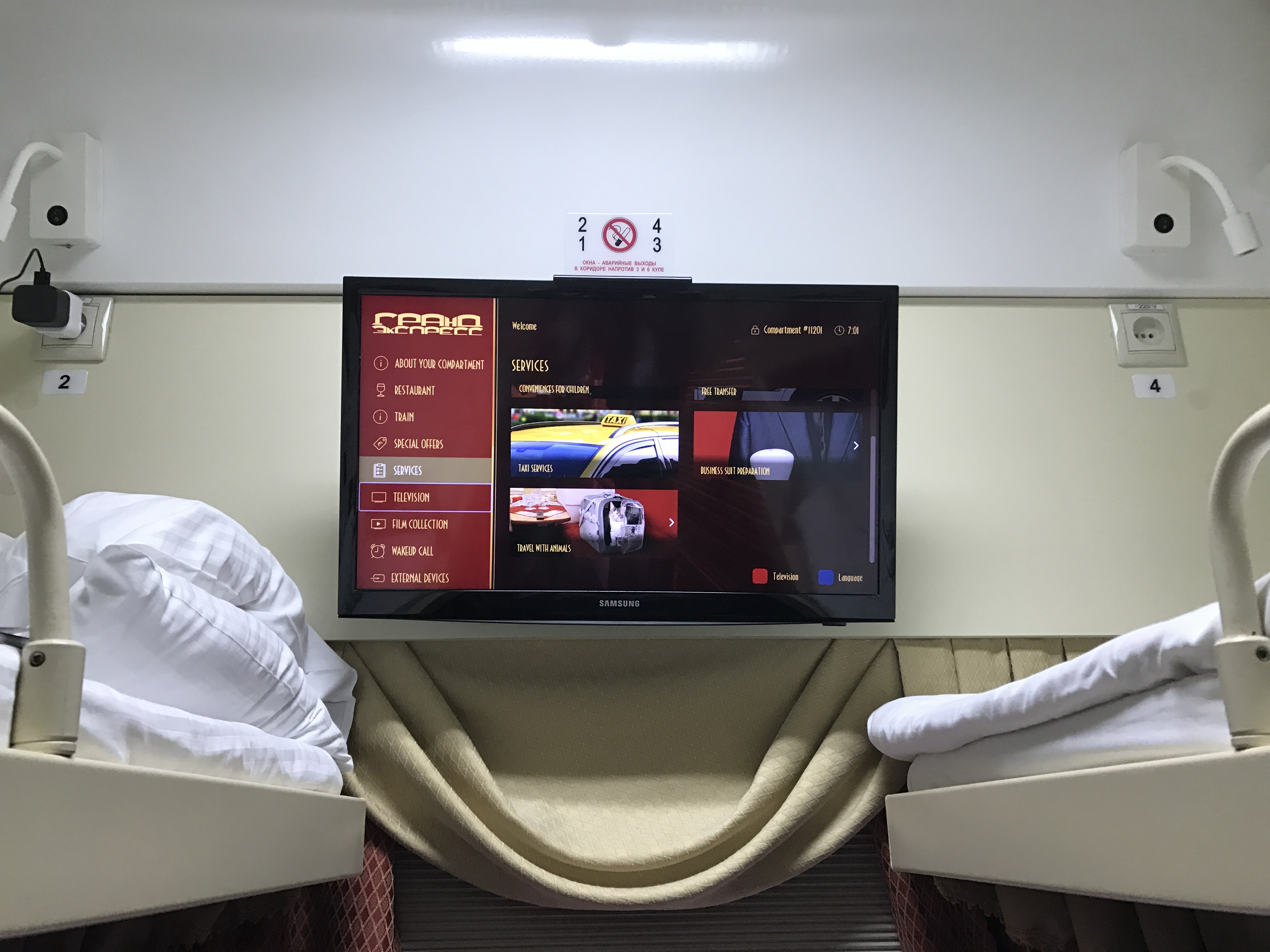 2300: Train arrives for 2344 departure and boarding starts. There’s a ticket and passport check at entrance to carriage. The Grand Express is a luxury private train running a sleeper service between St Petersburg and Moscow. The cabin is well appointed, good bedding and there’s also a digital TV with a choice of movies. In the standard carriage, there’s a toilet and washbasin in each carriage. You can also pay for a cabin with a private toilet and wash basin, or even one with a shower compartment.