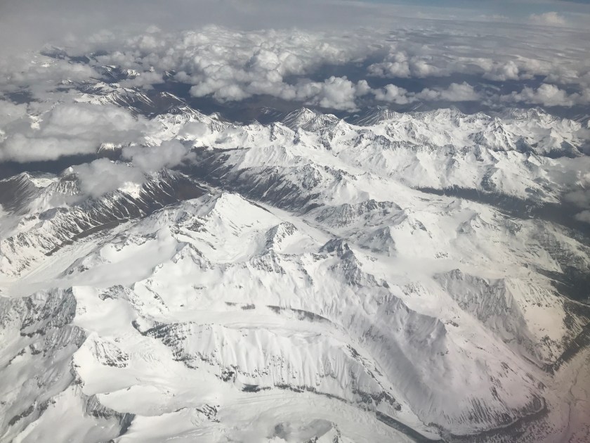 After take off from Chengdu, we were soon flying over the Daxue Mountains. Daxue translates to “Great Snow Mountains”. And these definitely lived up to their name. The mountain peaks were so high that they broke through the cloud cover. I have never seen mountains so close from a plane.
