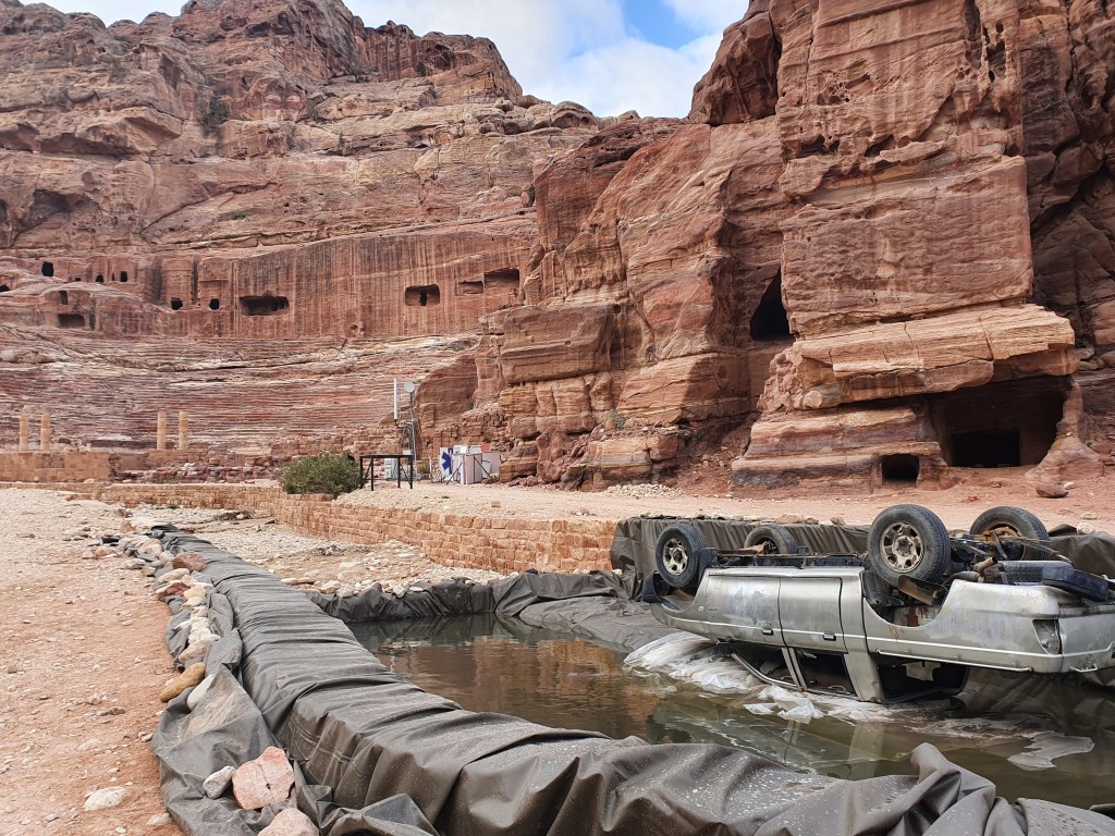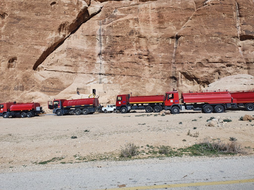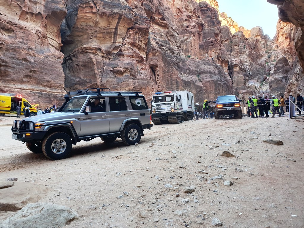 The is an emergency exercise being conducted today at Petra. They are simulating flash floods and a rescue operation. (Petra had real flash floods in December 2022) Many pools of water have been constructed (hence the reasons for the fire trucks filling up near little Petra). The pools are filled with dummies, and even an upturned vehicle.