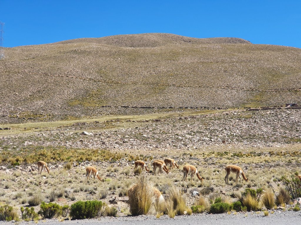 On our way again, we start to see many Vicunas. They are from the Camelia family, but Vicunas are wild and not domesticated like llamas or alpacs. There are about 25000 Vicunas in the Salinas and Aguada Blanca reserve. Many live in herds of one male and several females. Their fur is even more priced than Alpacas, due to higher quality and rarity. All the Vicunas in the national parks are rounded up once a year,  in a large civil and military operation. They are health checked and sheared, and set free (until the next year). Despite efforts to preserve them, they fall prey to poachers and loss of habitat, so the number of Vicunas is declining.