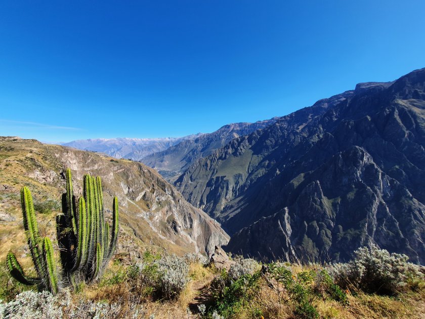 The Colca Canyon is the second deepest canyon in the world.  The canyon is about 68 miles long, with the deepest point being about 4km. Where we were, the depth of the canyon was about 3 km. It my view, it is pretty, but not in the same league as the Grand Canyon in the USA.