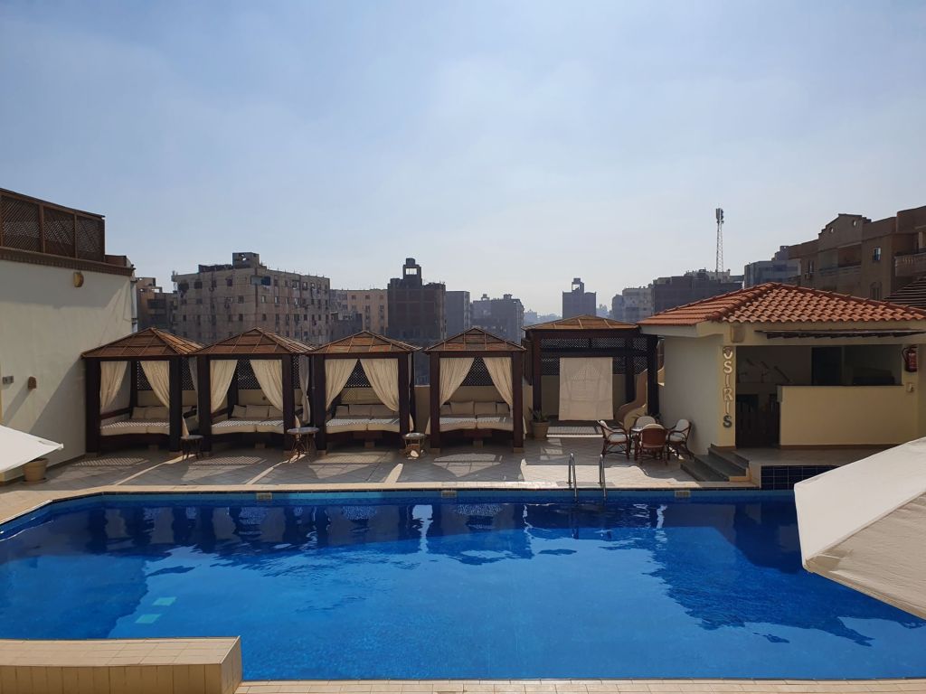 The Barcelo Cairo hotel is fairly quiet and there is a nice pool and a roof-top bar with views of the Pyramids of Giza. The sunset against backdrop of the Pyramids is absolutely spectacular.Β