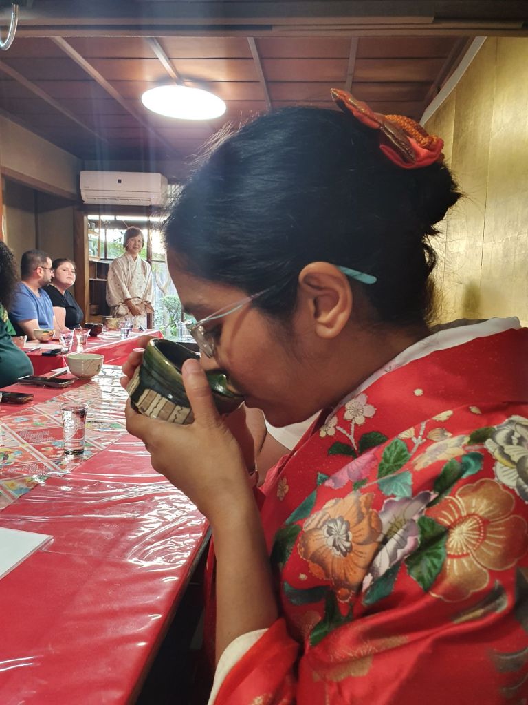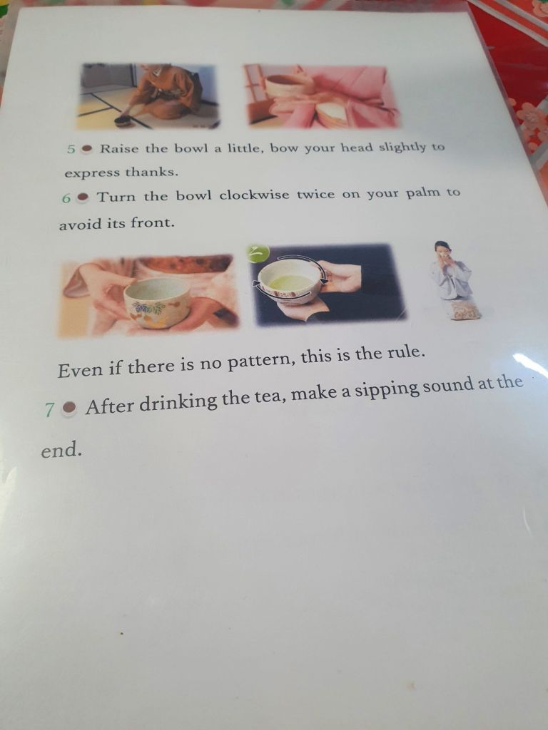 This is me, drinking the tea – bowl in the left hand, hold with the right and 3 sips.