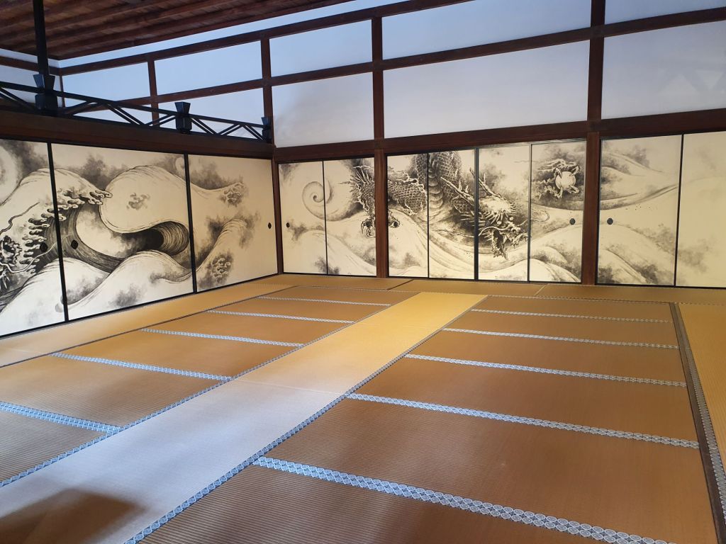 Ryoanji’s garden is viewed from the Hojo, the head priest’s former residence. Besides the stone garden, the Hojo features some paintings on the sliding doors (fusuma) of its tatami rooms. When we visited, the panels displayed a series of striking paintings by former Japanese Prime Minister Morihiro Hosokawa. The paintings depict the life of a dragon, from birth to death.