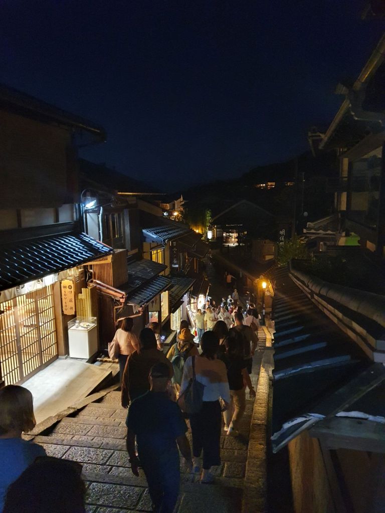Sannenzaka, or Sannen-zaka is a stone-paved narrow pedestrian path and tourist attraction near Kyomizu-dera. The path slopes down and is filled with shops and restaurants that sell traditional Kyoto products and food. According to our guide, if you fall down on this road, it means you will die within 3 years – not brilliant when you have to navigate it downhill in the dark with hundreds of others!