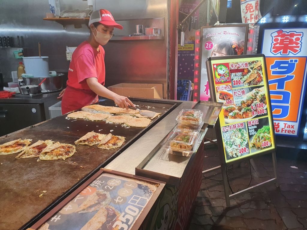 Finally for dinner, we tried a Osaka speciality called “Okonomiyaki” – a pancake, topped with finely shredded cabbage, meat (optional) and a cracked egg on top, cooked over a hot plate. It is delicious, quick and filling.
