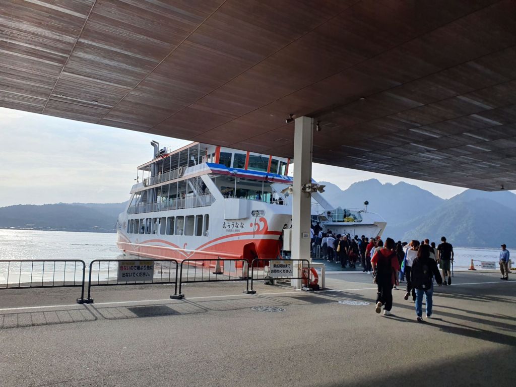 The ferry takes 15 minutes and there are frequent departures. Both the JR-Sanyo line and JR-ferry are covered by the JR pass (if you have one). So you don’t need to buy another ticket, but you do have to pay the tourist tax for Miyajima Island, (100 Yen) before boarding the ferry.