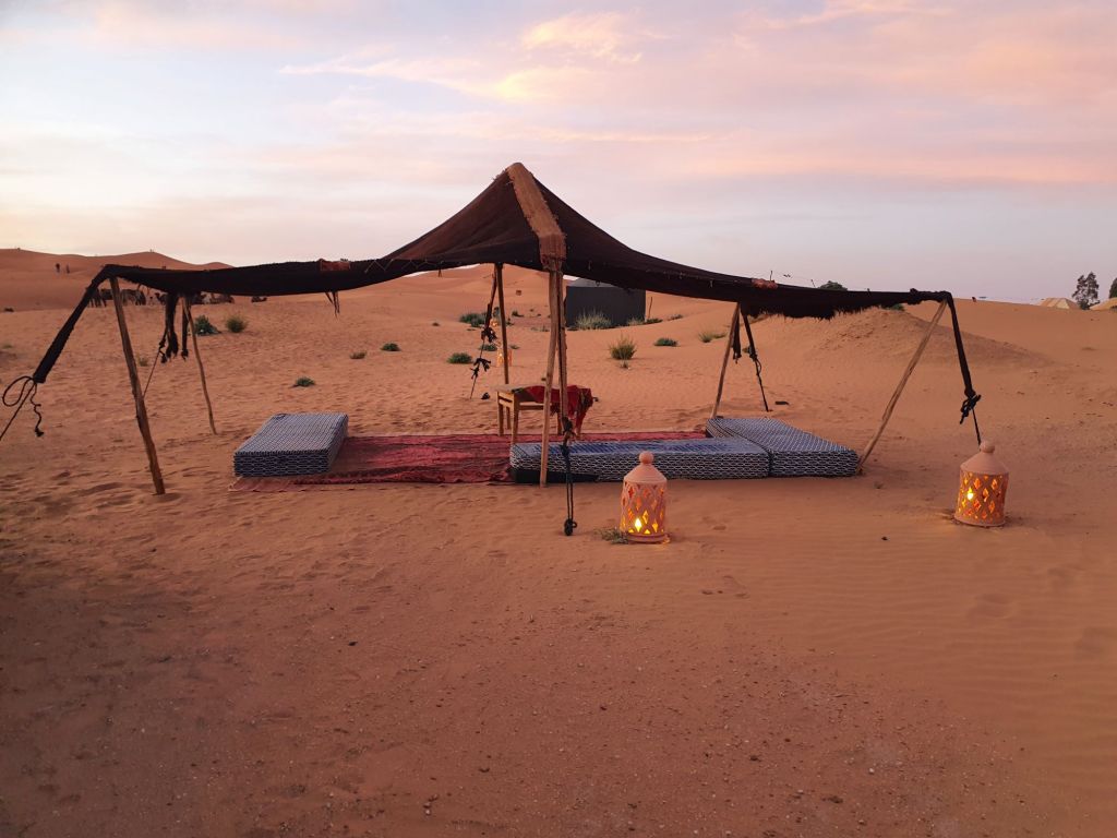 1830: In a little over an hour we arrive on the other side of the dunes at our campsite, perfectly timed to see a superb sunset over a cup of Moroccan tea.