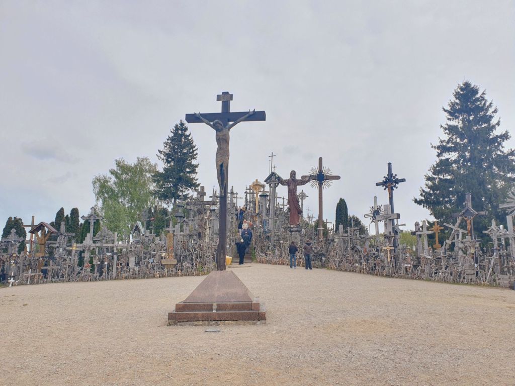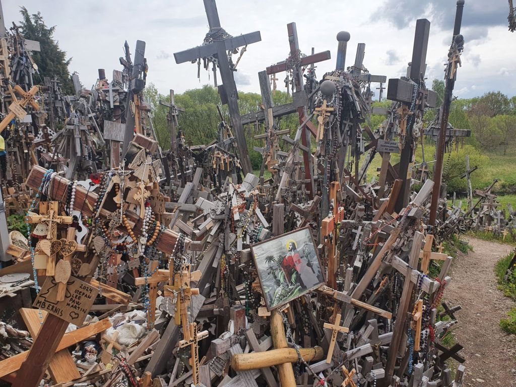 1230: We drive across the border into Lithuania, and soon come to our next stop, the Hill of Crosses.