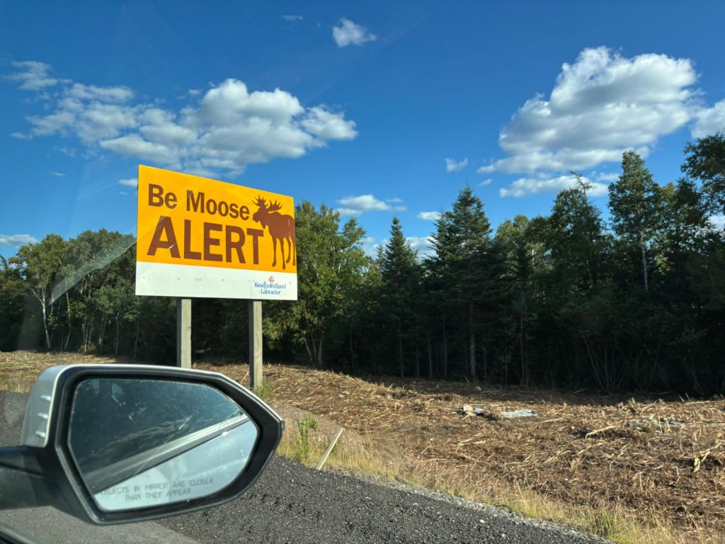 There are many signs on the road advising to keep an eye out for moose. Traffic accidents due to moose are not uncommon in Newfoundland. A male moose could weigh 500-800kg, so a collision with one at 100km/hr will leave the car and the moose both in very bad shape. The trees either side of the highway are cut back for a dozen or so meters to give good moose visibility.