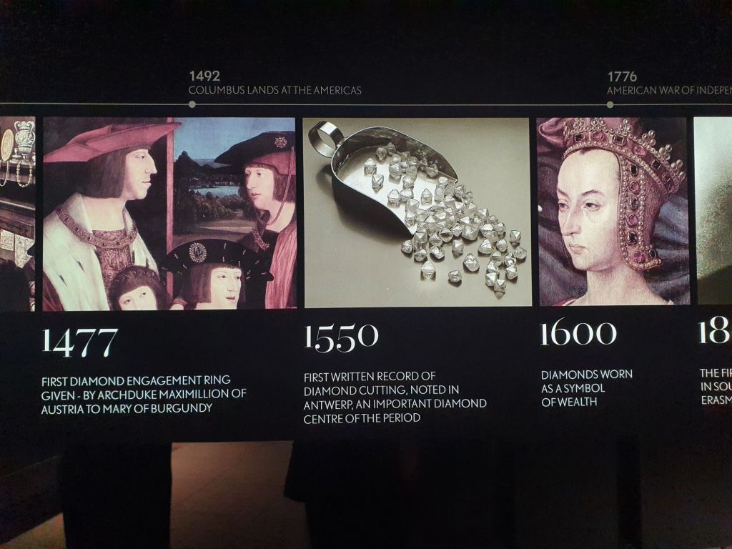 The museum covers how diamonds are made and there place in history. Diamonds were first referenced in 300 AD. In the 1400s they were given as betrothal gift between European royals, but these were uncut diamonds.