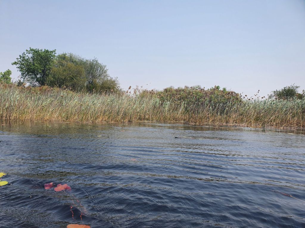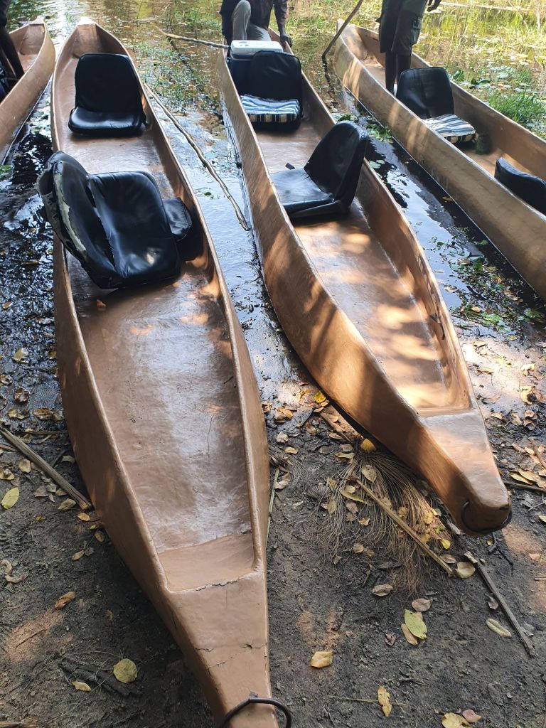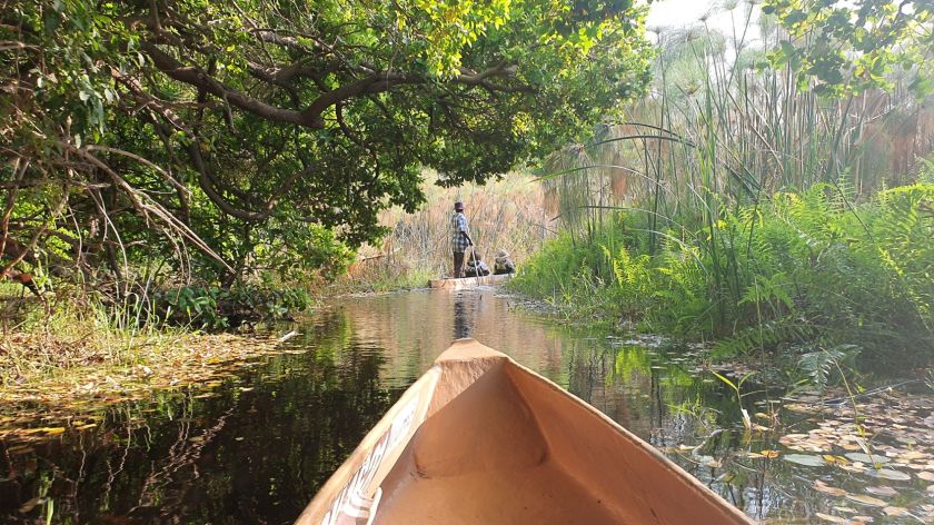 We are traveling in the Mokoros from the lodge onto an island for a nature walk. We are traveling through marshy papyrus fields, on “hippo channels”.