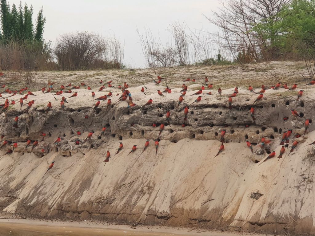 We also saw a nesting colony of Southern Carmine Bee-eaters, all crimson and turquoise, darting like flying jewels over the river.