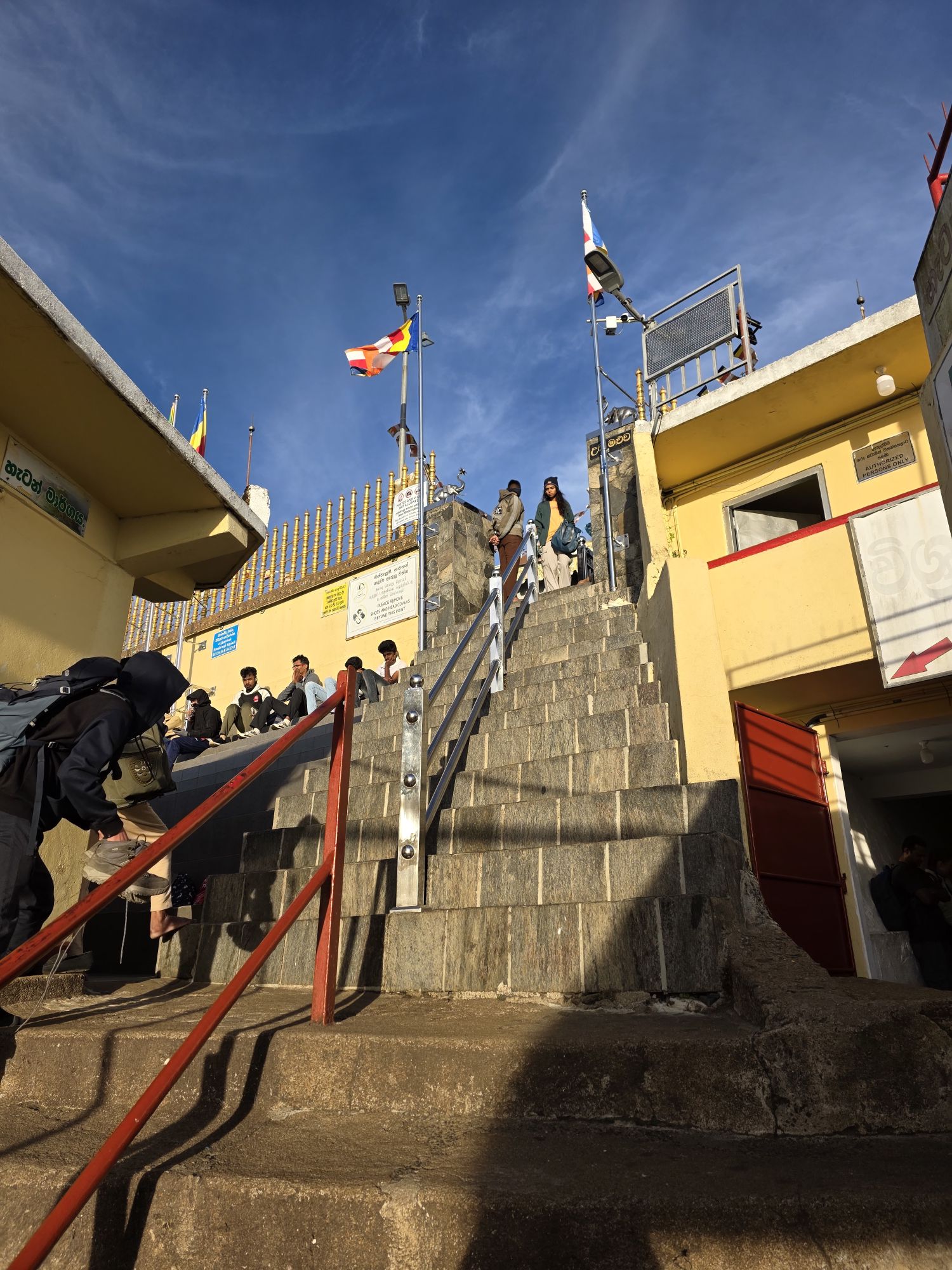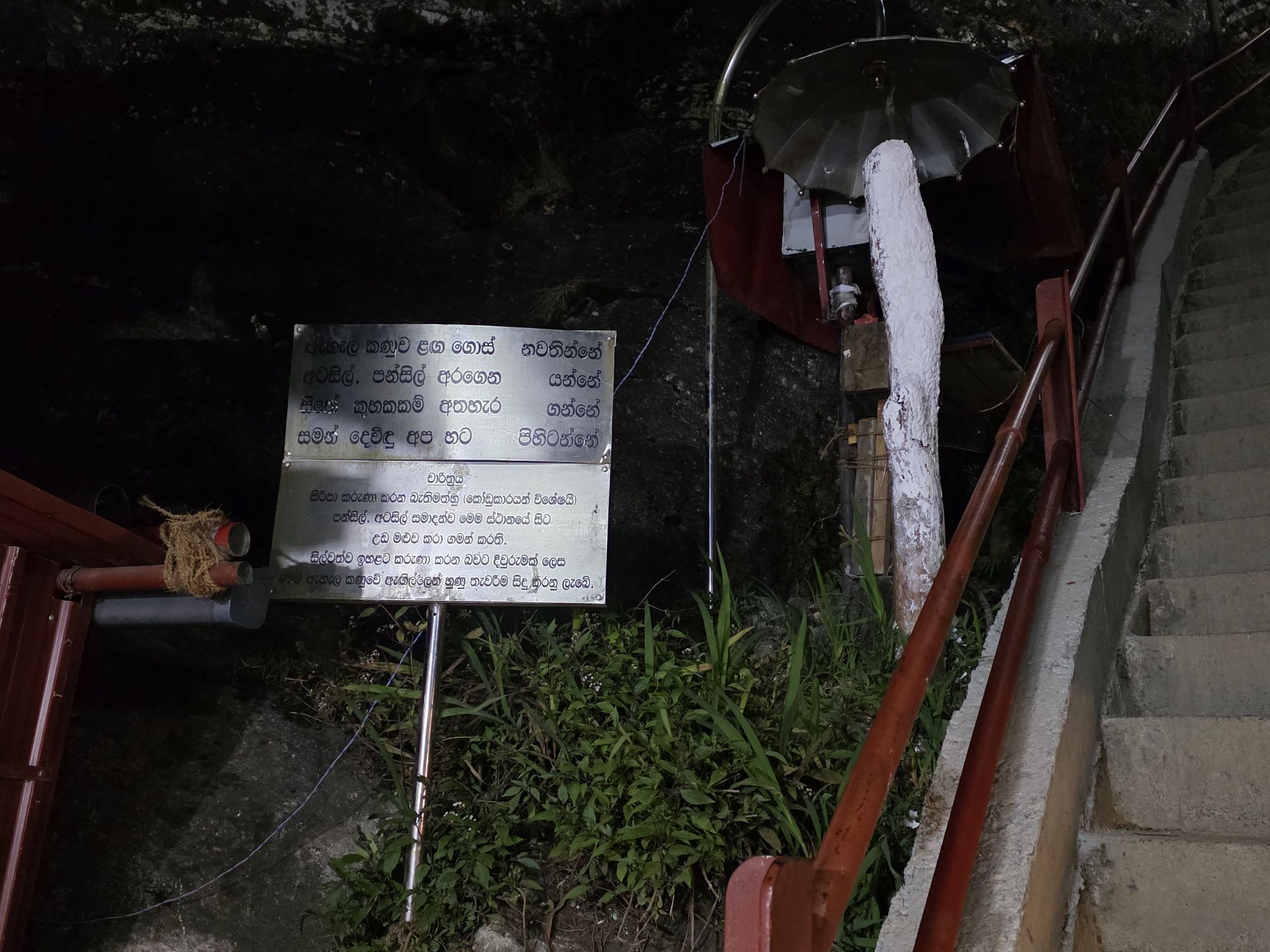 0440: After the hardest part of the climb, comes the last milestone. This is called “Ahela Kanuwa” (Meaning “pillar made from the Ahela tree”). There is a sign here reminding you to undertake the five precepts of Buddhism and make a promise to yourself to take the final few steps to the summit with a heart full of kindness and good thoughts. As a physical sign of of this promise, pilgrims would put a chalk mark on the “Ahela Kanuwa”. As a novice, this is exactly what I did (I could feel my temper starting to fray a little bit after nearly six hours of climbing, so it was a good reminder to mind my thoughts, words and deeds).